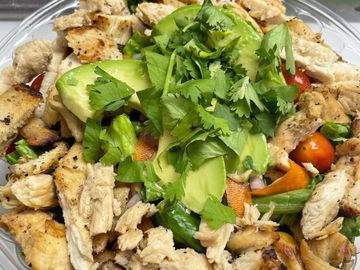 Grilled Chicken, Romaine Lettuce, Onions, Tomatoes, Avocado, Carrots, Cucumber