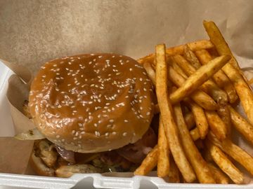 100% Beef, Cheese, Bacon, Lettuce, Tomato, Onions, Pickles and Mayo