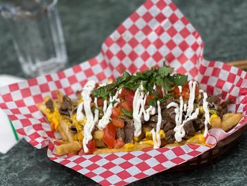 seasoned fries loaded with cheddar cheese, skirt steak, hot peppers, tomatoes, sour cream and garnished with cilantro