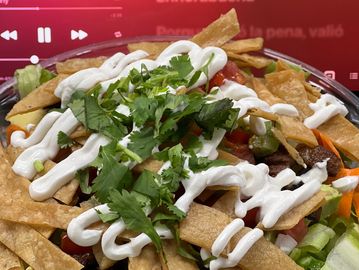 our amazing skirt steak, romaine lettuce, tomatoes, onions, hot peppers, cucumbers. Carrots, avocado, sour cream and homemade tortilla chips