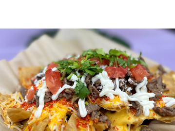 homemade Chips loaded with cheddar cheese, skirt steak, hot peppers, tomatoes, sour cream and garnished with cilantro